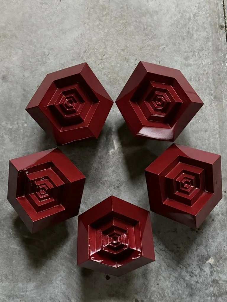Powers often begins a sculpture with a building, motif or story to which he’s conceptually drawn. In the case of this show, Levitating Pentagon, the phrase brings to mind a five-sided shape, but precisely cites the military institution and location of a legendary 1967 political protest. Devised by the Yippies led by Abbie Hoffman, the aim of this political theater was to levitate the Pentagon off the ground, to turn it orange and vibrational, and force evil emissions to flee. Powers was struck by this mythology, its woo-woo magical thinking fueled by anti-war conviction and psychedelics, and the cathartic absurdity of their resistance strategy. Taking the Yippies’ conceit one step further, he started sketching the Pentagon’s subterranean layout, envisioning its underground footprint which is famously larger than what we see at its surface.